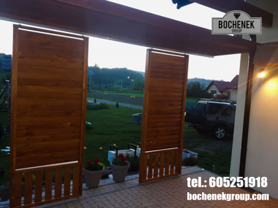 Nowoczesne zadaszenie tarasu z roletami rzymskimi, zrealizowane dla prywatnego inwestora.