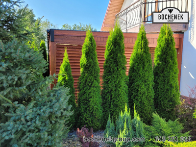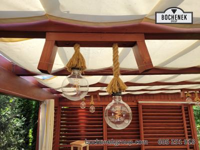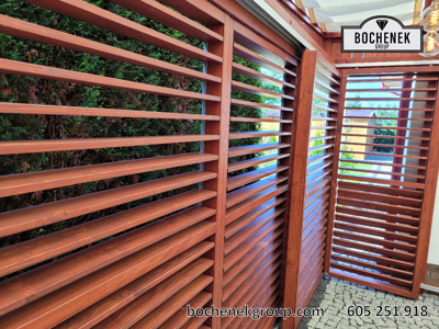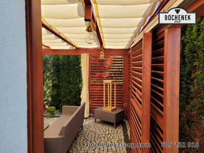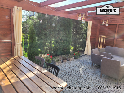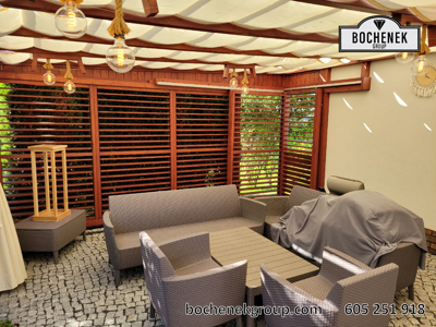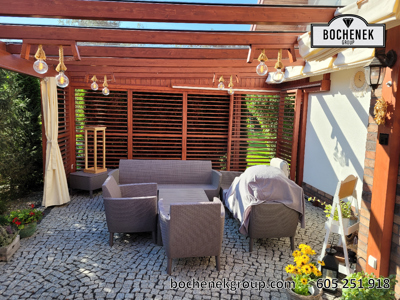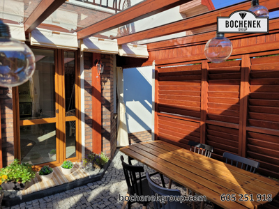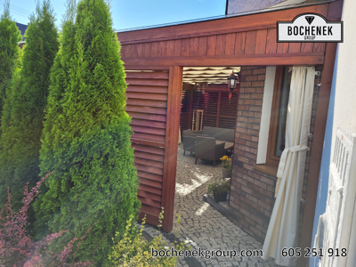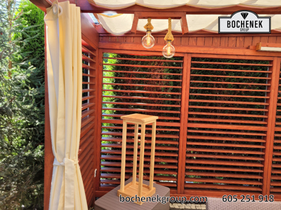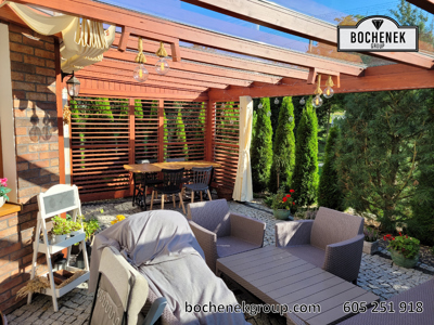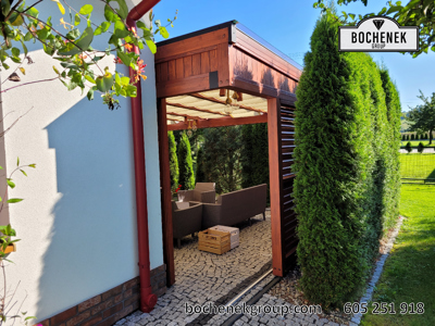 Dach wykonano z przezroczystej szyby, co pozwala na swobodny dopływ naturalnego światła, jednocześnie chroniąc przed deszczem i innymi warunkami atmosferycznymi. Dodatkową osłonę stanowią przesuwane rolety oraz boczne ścianki wyposażone w drewniane rolety, które nie tylko nadają konstrukcji estetyczny wygląd, ale również pozwalają regulować poziom zacienienia i zapewniają większą prywatność.