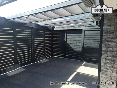 Nowoczesne zadaszenie tarasu z roletami rzymskimi, zrealizowane dla prywatnego inwestora.